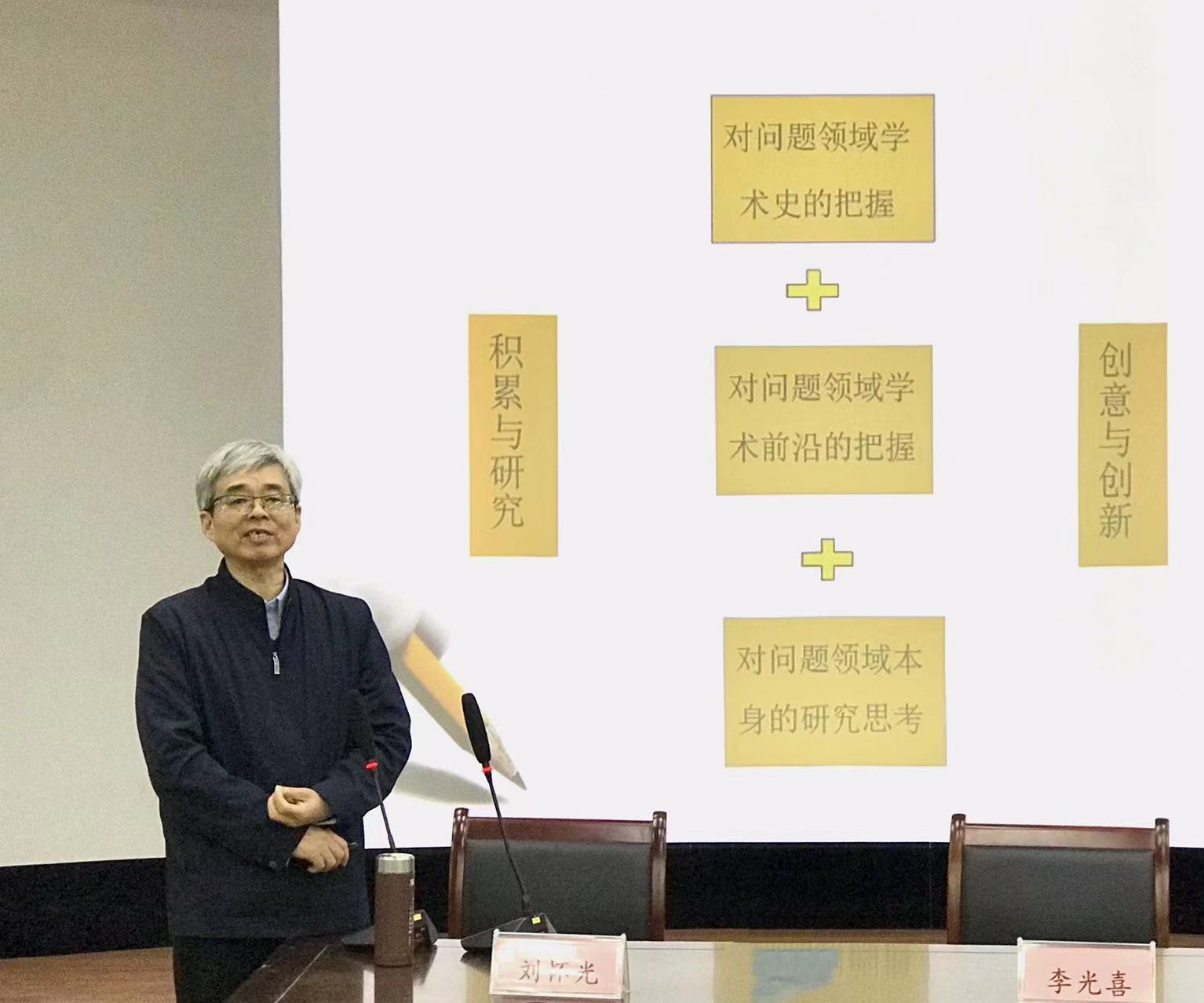 刘怀光教授作题为《社科项目申报中的课题设计与论证表达》报告。他从课题选择、项目申报书表述的基本要求、国家社科基金项目申报书各个部分撰写要求等方面做了细致的讲解,整个报告从大处着眼,从小处把握,既高屋建瓴又深入浅出,内容详实,针对性强。刘教授针对参会老师课题凝练、申报书撰写过程中遇到的难点与困惑,积极答疑解惑,现场气氛活跃。