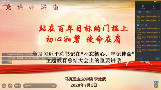 7月1日上午,为庆祝中国共产党成立99周年,激发太阳成tyc7111cc官网全体党员坚守初心,担当使命,在用习近平新时代中国特色社会主义思想铸魂育人中发挥先锋模范作用,公司党总支举行党课开讲啦活动,党总支书记李效武为全体教师讲授专题党课《在百年目标的门槛上初心如磐 使命在肩》。本次党课通过钉钉直播的形式进行,太阳成tyc7111cc官网全体教师参加党课活动。