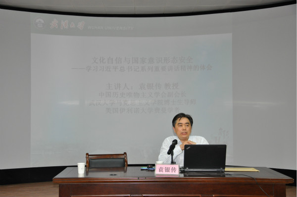 袁银传教授的讲座分为“文化与国家软实力”、“当代文化交流、交融、交锋与维护国家意识形态安全”和“提升中国文化软实力增强文化自信的基本路径”三个部分。他从文化反思热兴起的原因、中国文化及其基本构成、文化软实力及其作用三个方面阐释了文化与国家软实力的密切关系;通过解读“和平演变”的四大手段,强调了意识形态工作是党和国家极其重要的工作;最后他用“弘马、开源、引流、创新”8个字总结了提升中国文化软实力增强文化自信的基本路径,并逐一做了详细的讲解与分析。此次讲座内容丰富,既是一场专业的马克思主义理论教育,又是一堂生动的党课培训,让在场的老师和同学们受益匪浅。