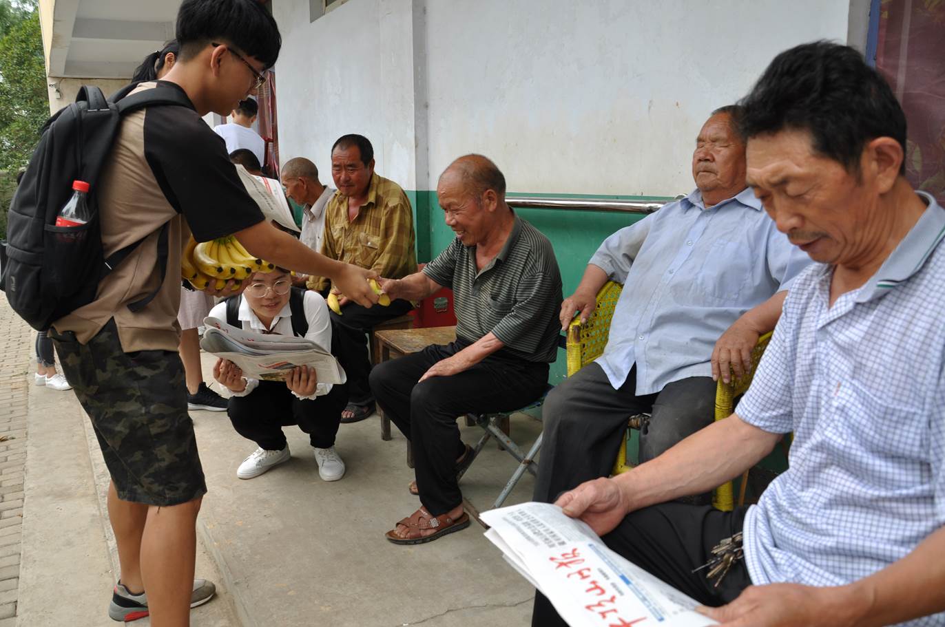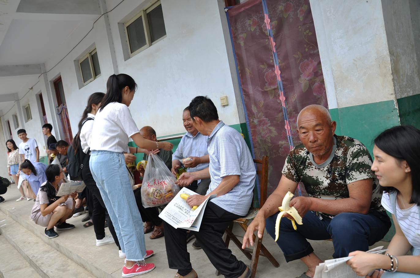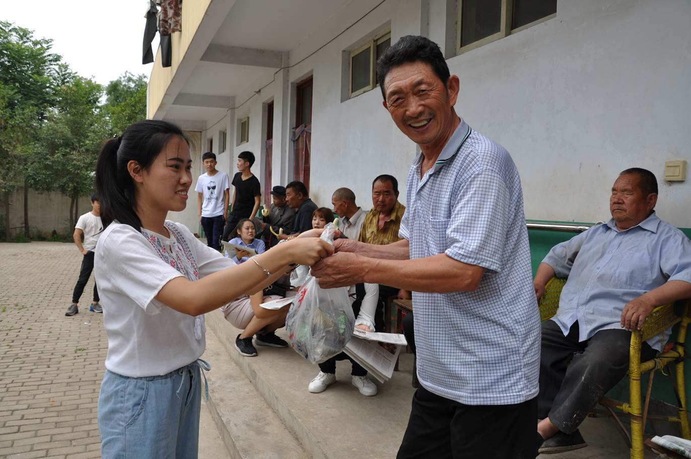 随后,同学们又来到郏县广天乡敬老院,开展了“尊老爱老,端午送粽情”的志愿者活动。老师和同学们提前为敬老院老人送上端午节的问候。在敬老院里,老师和同学们为老人们送上水果、粽子、面包、毛巾、报纸等慰问品,并亲手为老人剥吃水果、面包等食品,同时亲切地同老人们拉家常、嘘寒问暖,帮助老人剪指甲,了解老人的日常生活及健康状况。随后,同学们为老人们表演了相声、歌曲、豫剧《朝阳沟》,为他们揉腰捶背、剪指甲,在同学们关心的话语中,老人露出了幸福的笑容和甜甜的微笑,感受到了老师和同学们带来的温暖和快乐。