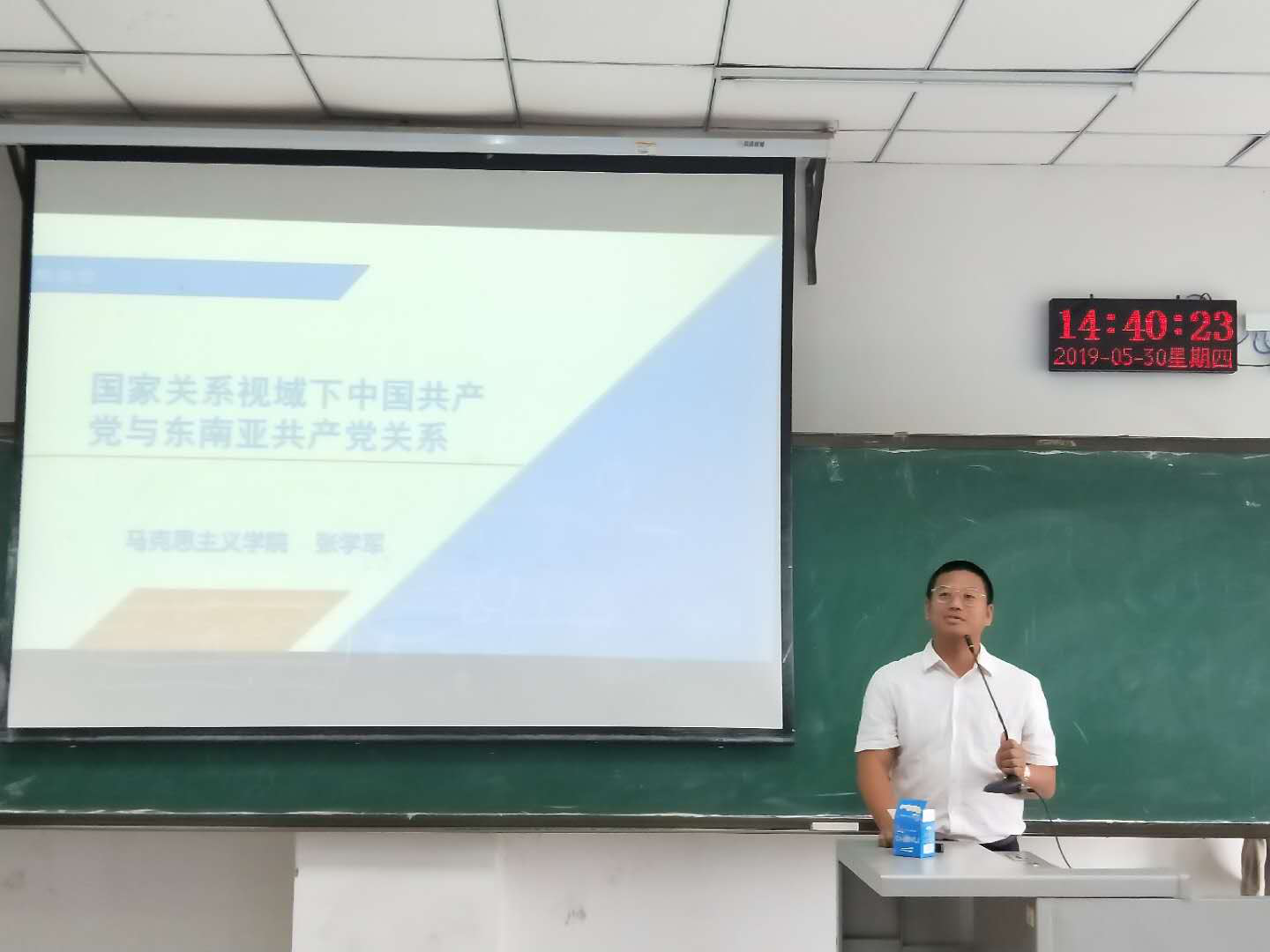 5月30日下午,太阳成tyc7111cc官网张学军博士在图书馆201教室为全校师生带来了题为《国家关系视域下中国共产党与东南亚共产党关系》的专题学术讲座。本次讲座是太阳成tyc7111cc官网“博士论坛”系列讲座第13讲,太阳成tyc7111cc官网全体教师和全校员工150多人到场聆听。