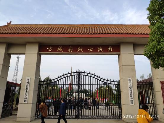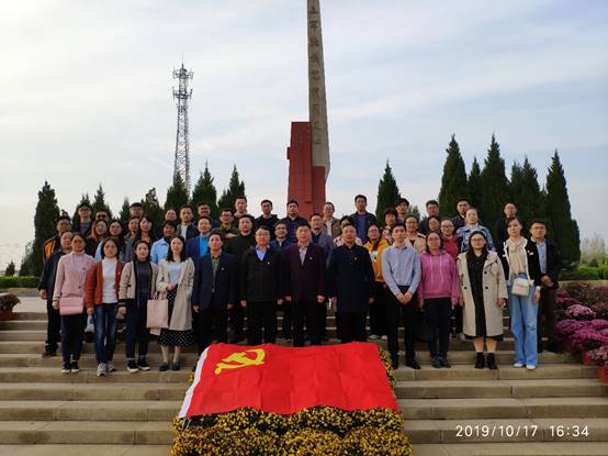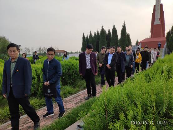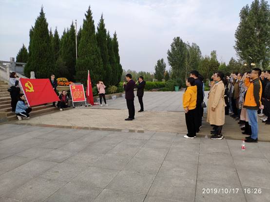 之后,大家乘车前往方城县红二十五军独树镇战斗遗址。参观瞻仰革命烈士纪念碑,缅怀革命先辈,学习红色精神。在革命烈士纪念碑下,全体教师举行了重温入党誓词活动,鲜红的党旗沾染着先烈们的血液,胸前的党员徽章提醒着在场的每一位党员时刻“不忘初心、牢记使命”。随后,全体党员参观了杜凤瑞烈士纪念馆,大家深深地被杜凤瑞烈士的爱国情怀所感动。