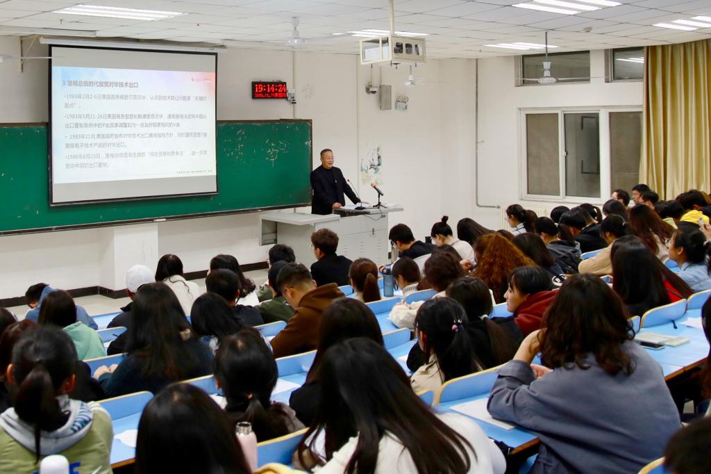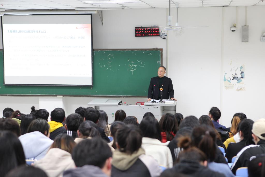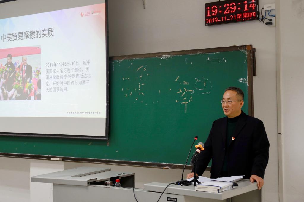 课堂上,王文鹏书记首先从中美建交至今的关系入手,对1972年中美建交、六方会谈、中美联合反恐合作等内容进行了回顾,并从“中美经贸关系发展的阶段性特征、40年来中美关系所取得的成就、中美贸易摩擦的实质和中国应对中美贸易战的王牌及战略抉择”四个方面深入展开分析。在授课中,王文鹏书记注重理论与热点相结合,通过对“华为事件”、“美国大豆进口事件”、“中美关税磋商”等典型案例的讲解与分析,让同学们进一步理解了中美贸易摩擦的本质。