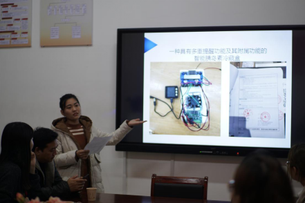 这是电气与机械工程公司工程公司18级孙倩同学,她带来的作品是一种新型具有多重提醒功能及其附属功能的《智能胰岛素冷藏盒》,除了科技含量高,还满满都是人文关怀!