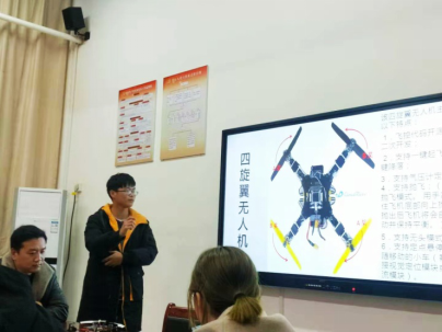 18级梁子威同学带来的是“四旋翼无人机”,他介绍了这款无人机的功能,并分享自己在设计制作时遇到的种种困难,他认为只有不断地调试、试验、磨合才能够创造奇迹。