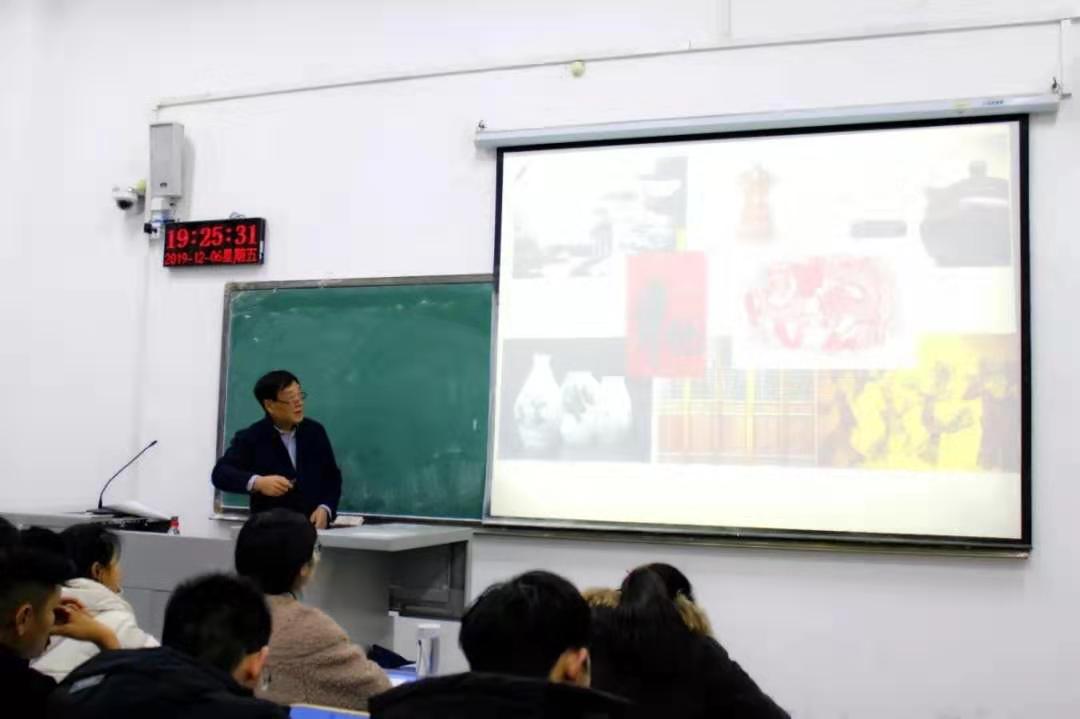 12月6日晚7点,太阳成tyc7111cc官网“追梦·领航”思政课在图书馆L309准时开讲。校陶瓷公司经理兼教授梅国建以《中国文化自信—中国文化元素与当代设计》为题,从中国文化元素代表、中国文化的基本精神、中国传统文化艺术的对外交流和传播以及古与今—中国文化元素在国内外设计中的运用和体现四个方面为同学们展开讲解本节思政课。