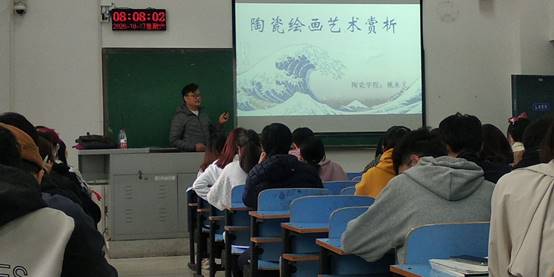 课堂上,姚来义教授首先以“什么是陶瓷绘画”为题发问,同学们积极讨论,融入课堂氛围。授课过程中,姚老师通过展示新彩瓷板画、青花彩绘、釉上彩瓷板画、高温颜色有瓷板画的精美图片向同学们解释了陶瓷绘画这一概念。除此之外,姚老师分别对粉彩、釉上五彩、斗彩、墨彩、广彩、新彩这几种釉上彩绘画的类型也做了详细的介绍。在图片展示中,几张图案精美、色彩斑斓的釉上五彩瓷器的图片吸引了同学们的目光,姚来义教授谈到:“釉上五彩瓷器,基本色调以红、黄、绿、蓝、紫五色彩料为主,非常符合东方色彩的美学观。”通过对陶瓷绘画艺术鉴赏的学习,同学们深入了解了中国陶瓷的发展源远流长与陶瓷文化的内涵与艺术魅力,并且懂得了陶瓷艺术不仅是中国文化的代表,而且也是讲述中国故事、传递中国声音的“窗口”。