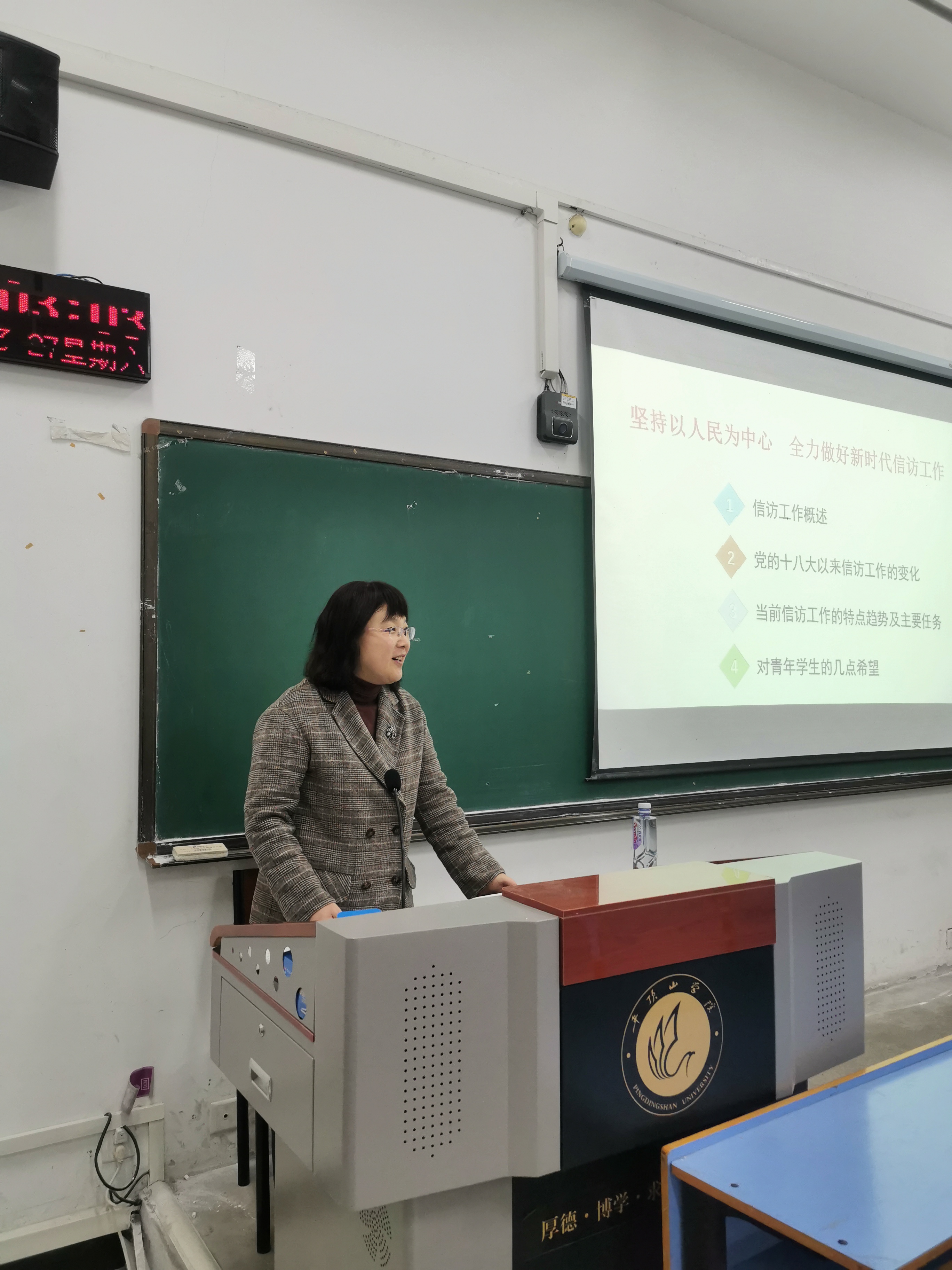 3月27日上午,在图书馆203教室,荣幸邀请了平顶山市信访局副局长高平珍为同学们授课。高平珍老师以《坚持以人民为中心 全力做好新时代信访工作》为题给同学们上了一堂内容丰富、条理清晰、生动活泼的思政课。