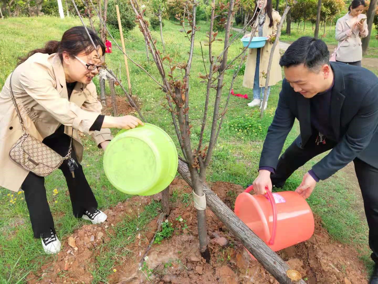 到达目的地后,老师们就开始忙活起来,有人去湖边提水,有人分水,有人开始为小树松土,一个个都配合默契,干的热火朝天。