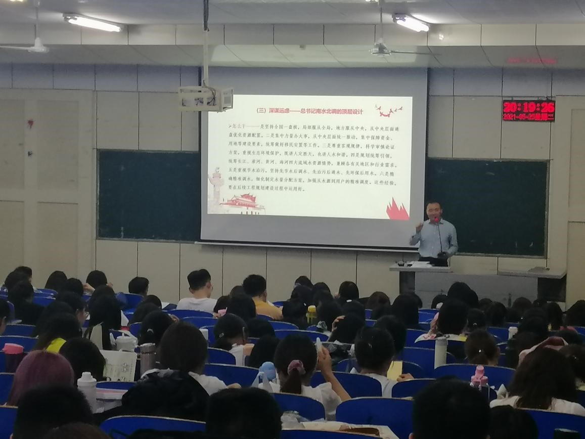 田建伟教授指出,南水北调工程是中华民族的世纪创举,是守民心工程,要深刻领会南水北调的建设历史和党中央的高瞻远瞩和顶层设计,进而从怎么看、怎么干、怎么管、怎么谋等方面思考党中央的重大决策部署?从身边的变化,感受我们所在的城市,平顶山市作为南水北调第一个受益城市,感受南水北调的重大贡献,增强爱党爱国爱校情感。